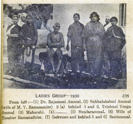 In the early editions of Self-Realization, B. V. Narasimhaswami’s English biography of Bhagavan, there was group photo entitled ‘Ladies Group – 1930’. It is a rather murky picture but it contains a large unkempt woman who is identified as Sundarammal. There are two Sundarammals in the Ramana literature, both of whom have remarkable stories.